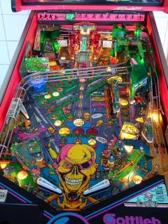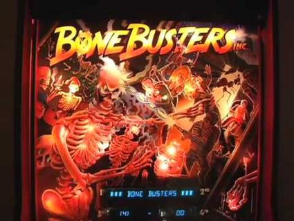 For some unspecified reason, Chicago is under siege by an army of undead skeletons, and the only ones who can stop them are the brave men and women of Bone Busters, Inc. While the disembodied head of Ol' One-Eye turns and taunts you from above the backbox, purge skeletons from the Jogging Path, the Fast-Food Restaurant, and the Elevated Subway, then head for Lower Wacker Drive and advance the awards. Shoot the center fountain to collect the Water Tower Bonus, discover the secret of the Opera Bonus, and find Liz's Surprise for more points. Energize those playfield zap rods, lock three balls around town, then make the Long Jump to start multiball and clean up the burg.