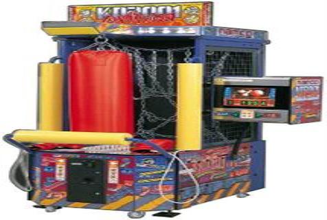 A boxing simulator where the player wears real boxing gloves and strikes the punching bag in the cabinet to register a win or a loss against the machine's computer. Statistics and information are displayed on a monitor on the right side of the cabinet. Factors include the player's power, techniques, speed and spirit.