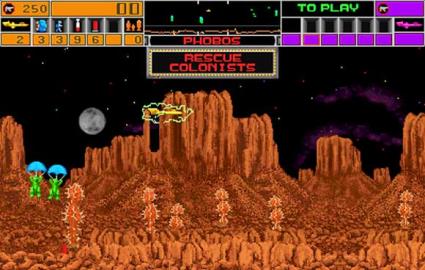 A shooter that plays similar to Defender with updated graphics. Controls are slightly different in the sense that there is no separate thrust button.