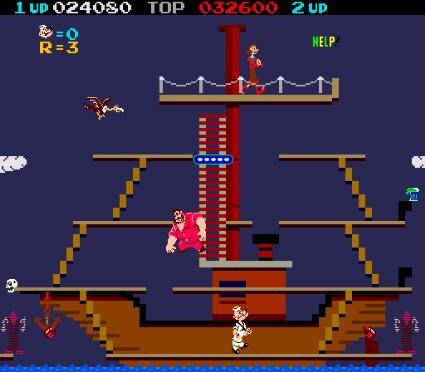 You control Popeye the sailor man in one of three different stages. Stage 1, you collect hearts to win Olive's love. Stage 2, you collect notes to serenade Olive and Sweet Pea. Stage 3, Olive has been captured and you must catch her cries for help to rescue her. Bluto is a constant nemesis. He throws bottles at you. He can hit you from above or bellow. Grab the spinach and you can go after Bluto and show him who's boss! The game repeats the same three stages with increasing difficulty, including sea hags and bouncing skulls.
