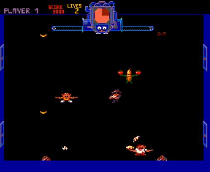 Player has a choice of three characters. Characters wander around a playfield while foodstuffs cascade down from the top. Player grabs a pie (for example) and chucks it at NPCs or the other player. Features 2-player dual joystick control and released the same year as Robotron,