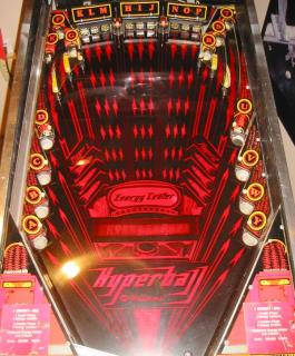 A flipperless, target shooting pinball where you fire balls at lettered targets to destroy waves of energy bolts fired at your energy center.