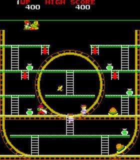 You control a caped man who attempts to rescue his girlfriend while attempting to avoid monkeys on roller coasters.