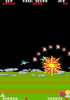 An alien shoot-em-up that mimics flight inertia quite well. In this game you have two weapon systems: one slow double-shot cannon and one fast single-shot cannon. You can fire slow bullets or fast bullets, but you only get limited supply of fast bullets. Bonus points are awarded for accuracy. With each enemy hit by the slow cannon you get one shot added to the fast cannon ammunition supply. After each stage there is a challenge stage where you can also build your fast-shot supply.