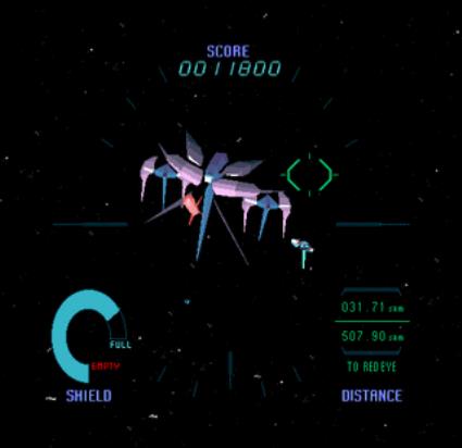A 3-D view first person space shooter. The deluxe sitdown cabinets feature rumble seats which vibrate when hit by enemy fire. A player is equipped with a shield bar which depletes with enemy hits. If you run out of shields, you must insert coins to keep playing.