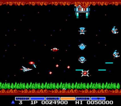 Based on the arcade game, Gradius is a side-scrolling shooter. Shooting certain enemies will leave a power up pod behind which can be collected to add more power to your ship. Each level features a wide variety of enemies trying to stop you, with a large boss at the end. Gameplay is for one player or two players alternating.