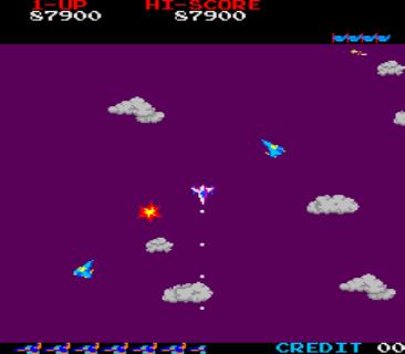 You pilot a time ship capable of going into various time periods and defeating the enemy forces of that time era. You start in 1910 when planes were slow and just starting out. Wipe out entire formations for bonus points. Rescue survivors for extra points depending on how many you rescue per time era. Destroy enough of the enemy to bring out the boss plane. Defeat it and you move on to the next time era. You then face faster enemies and smarter firepower in later time periods.