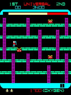 Labyrinth type game where you dig holes to trap aliens. The main character can move along platforms and climb the ladders between them. The goal is to dig holes in the platforms and lure aliens into them. Hitting a trapped alien with the shovel knocks them out of the hole and off the screen. In later levels, two or more holes must be lined up vertically in order to dispose of stronger aliens. There is a limited supply of oxygen, which acts as a timer. The game was ported to the Colecovision and the Apple II computer as "Apple Panic".