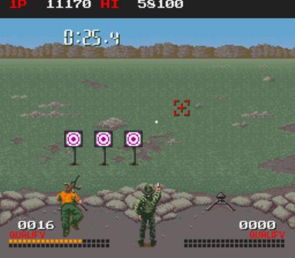 A combat training game where two players compete in a variety of challenges like obstacle courses, target practice, and more. After completing all events successfully, you graduate and are sent on a rescue mission to save the president from terrorists. Think Track & Field with a military theme.