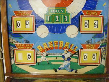A mechanical bat swinging game where a marble is rolled toward a heavy flipper resembling a baseball bat. Successful shots either put a mechanical runner on base and/or drive in mechanical runners back home and scoring points for that player.