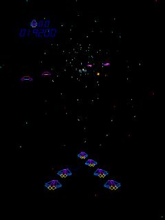 A vector graphic space shooter where you pilot a formation of ships sent to destroy the enemy armada. You control the entire formation as a single unit. Along the way, you may choose to chance the shape of the formation... possibly making it easier to hit your enemy... or perhaps making it harder for the enemy to hit you. The game starts out as a vertical shooter but then switches to a more intense 3D view. Survive that and you must navigate through a series of rings. The navigation of rings causes your view to revert back to vertical view, and the game starts over with increased difficulty.