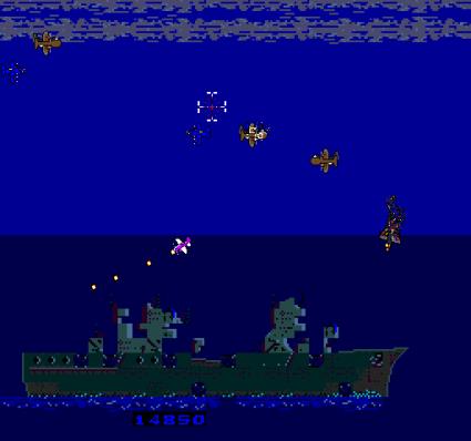 In the one-player and co-operative modes, the player(s) attempt to sink battleships by dropping bombs and fallen planes on them. Collisions with other planes and/or gunfire from the ship will result in the loss of a life. Players have unlimited lives, but may only allow three battleships to escape. In the dogfight mode, the players attempt to destroy all of his/her opponent's planes. After doing that, the loser of the dogfight must defend his ship(s) from the victor. There are various differences between ROM sets in these regards.