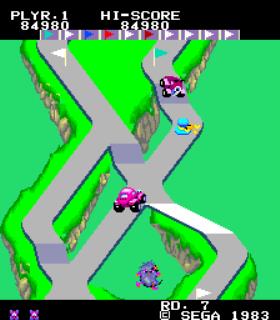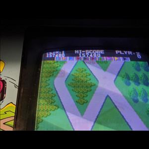 An unusual racing game where you travel along diagonal roads avoiding obstacles like other cars, roadblocks, and gaps in the road. This game was licensed to Bally Midway for distribution.