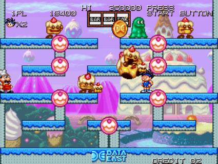 Two asian teenagers wearing gym gear must jump up and down levels and fire at monsters. After shooting the monsters a few times the enemies become fat and can be jumped on and bounced around the screen to destroy other monsters. Players can withstand being hit by food up to two times, but if a monster touches a player, he dies instantly. Move left or right, jump up, pull down and press Jump to navigate platforms. Fire once at a moster and it will become stationary and wait to be fully blown up or deflate. Once fully inflated, the monster can be jumped on and bounced around the screen destroying other monsters.