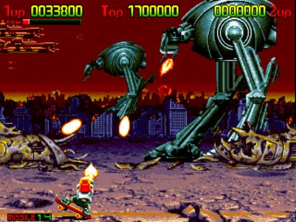 Strange reptilian-looking aliens are invading earth and is up to the most brave and skilled soldiers (apparently a duo of skateboarding youths!) to stop the invasion and destroy the enemy base. Features nice graphics and great shoot'em up gameplay which is quite similar to "Cabal" & "Blood Bros.".