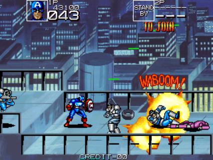 You control one of the four superheroes that made up "The Avengers". Punch kick and zap the enemies along the way until you reach a boss character at the end of the stage. Your character has a health meter that reduces as you take damage. Run out of health and your character becomes unable to continue. You may insert additional coins to continue. Make your way to Red Skull and take him down, but he's real tricky to beat. The character you play depends on which start button you press.