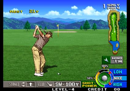 Pick from eight different golfers each with different attributes and select from four different golf courses (Germany, Japan, Australia, U.S.A). You can play stroke play against the CPU or stroke play and/or match play against a second player.